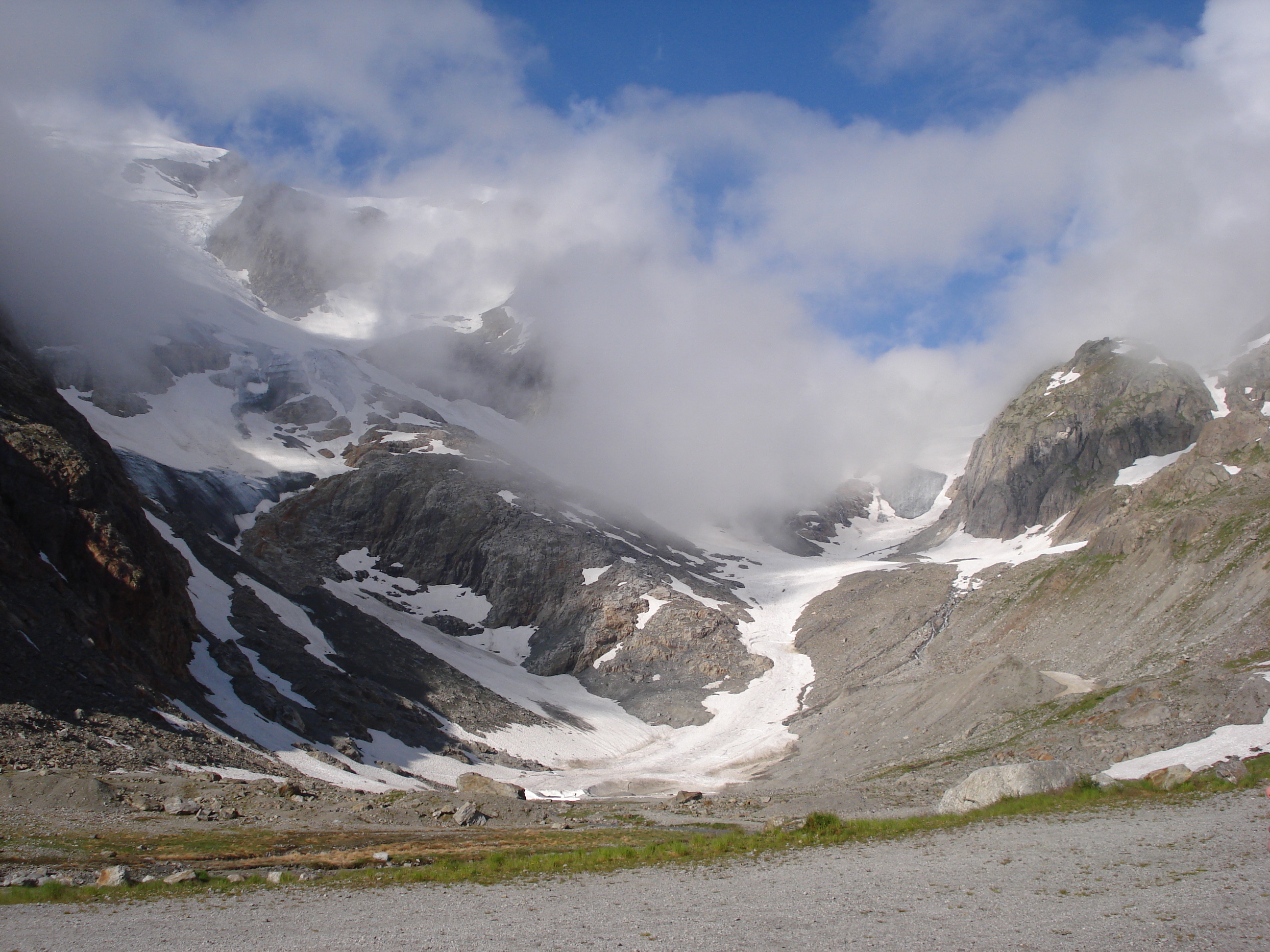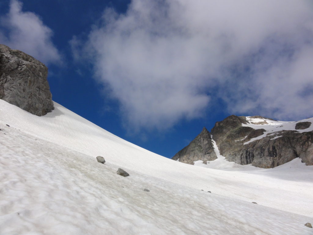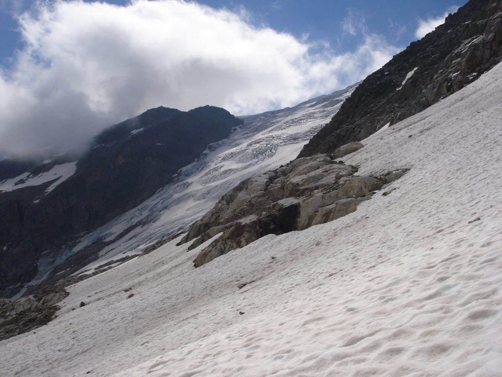 Weiter oben wurde der Gletscher wieder breiter. Wir gingen im leichten Zickzack bis zum Grat, Punkt 2734, anstatt durch den Schmalen Spalt zu gehen.