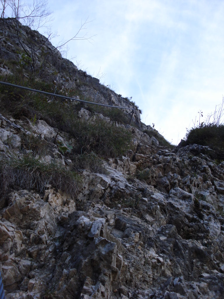 Steig: Bereits der erste Zug nach oben hat es in sich, ich ächze und vanille hinter mir sagt, dass es nun so weitergeht…auf was habe ich mich da nur eingelassen?! Zug für Zug kommen wir voran, der Steig ist definitiv nicht von schlechten Eltern. Ich vermisse bald mal meine Kletterfinken und den Magnesiabag. Viel zum halten bietet der Felsen definitiv nicht, ohne das Stahlseil wäre man hier aufgeschmissen. Bei den schwierigsten Stellen gibt es Stahlbügel. Ich kombiniere immer wieder Felsen mit Stahlseil, bei vielen Stellen können wir uns nur mit Hilfe vom Stahlseil hochhangeln, keine Chance ohne. Einige Male machen wir Pause und hängen uns in die Standsicherung. In der Hälfte des Steiges kommen wir auf ein Grasplateau, hier machen wir kurz Pause und geniessen die super Aussicht. Und schon geht es weiter, ein kurzes Stück ist es etwas einfacher, danach geht es umso mehr zur Sache. Es wird sehr luftig und überhängend, ohne Muskelkraft und sich hochdrücken/wuchten geht da gar nix. Weiter oben gibt es noch eine Traverse, viel Luft unter den Füssen und der Felsen bietet noch weniger um sich zu halten. Wir kommen oben an, sind völlig durchgeschwitzt aber happy es geschafft zu haben. Es ist der schwierigste Steig den wir beide je gemacht haben.