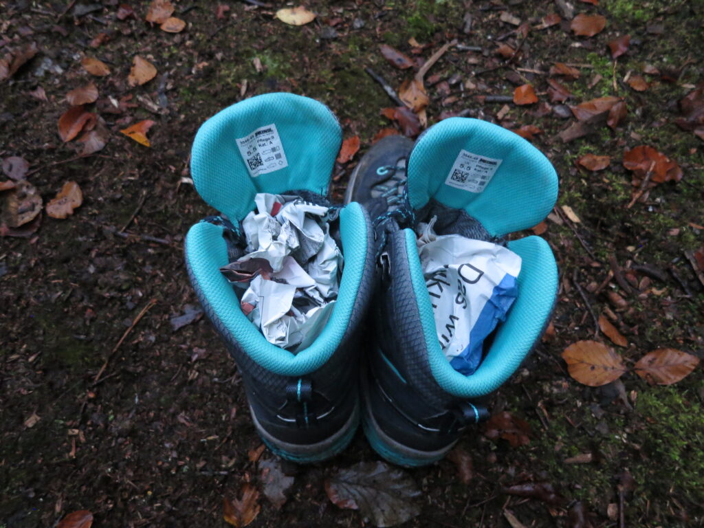 – Nachts die Schuhe damit ausstopfen. Schützt vor Feuchtigkeit und Schnecken