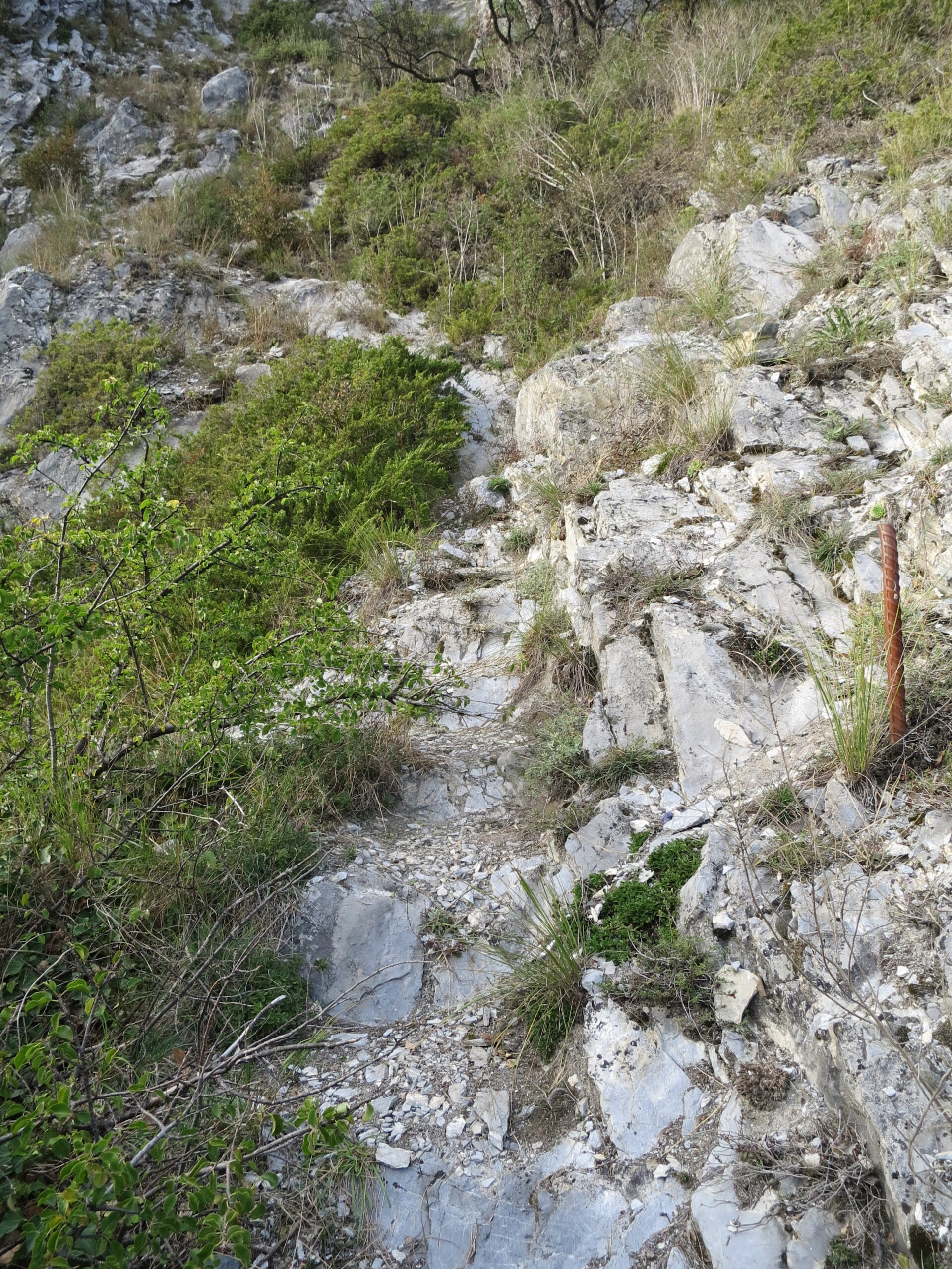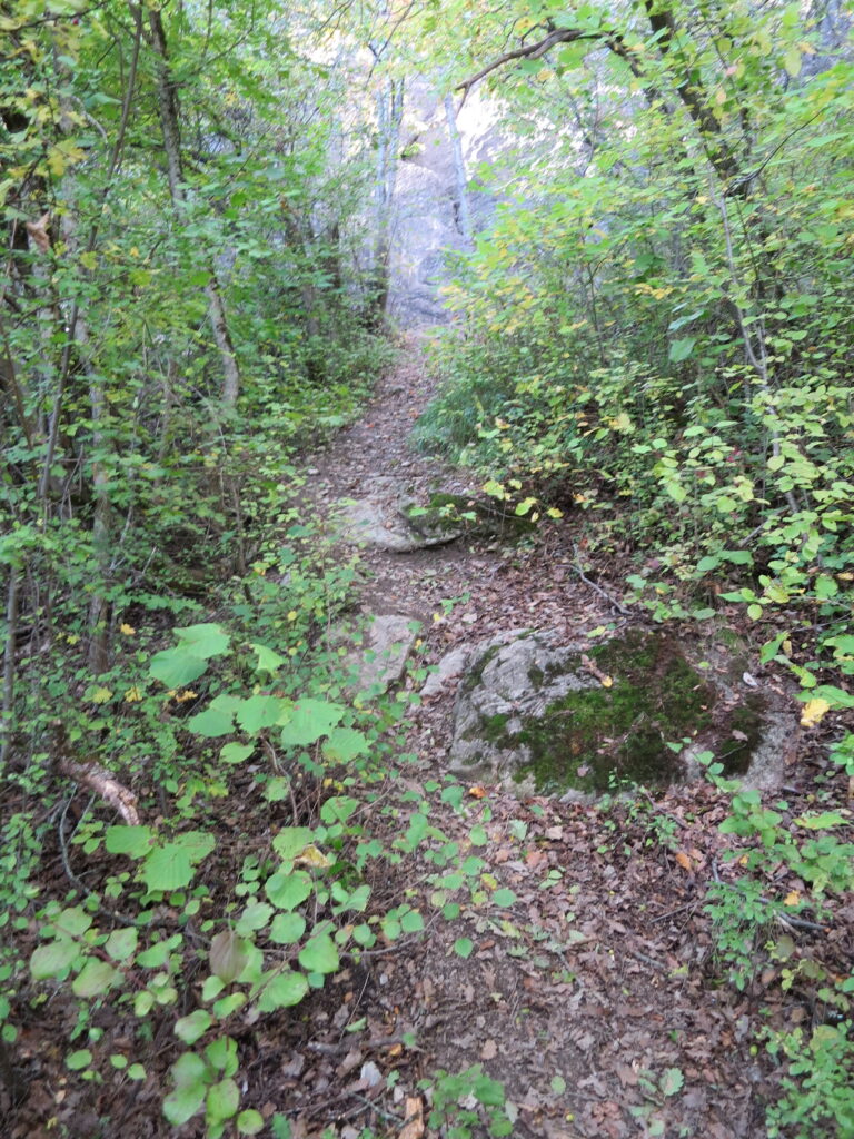 Zustieg. Dem Wanderweg folgen, beim Waldkindergarten durchgehen. Der Pfad wird dann schmaler und die Vegetation bleibt teilweise in den Haaren hängen. Kommt man beim rostigen Irgendwas vorbei, ist man richtig. Kurz darauf geht rechts ein Weg nach oben weg.