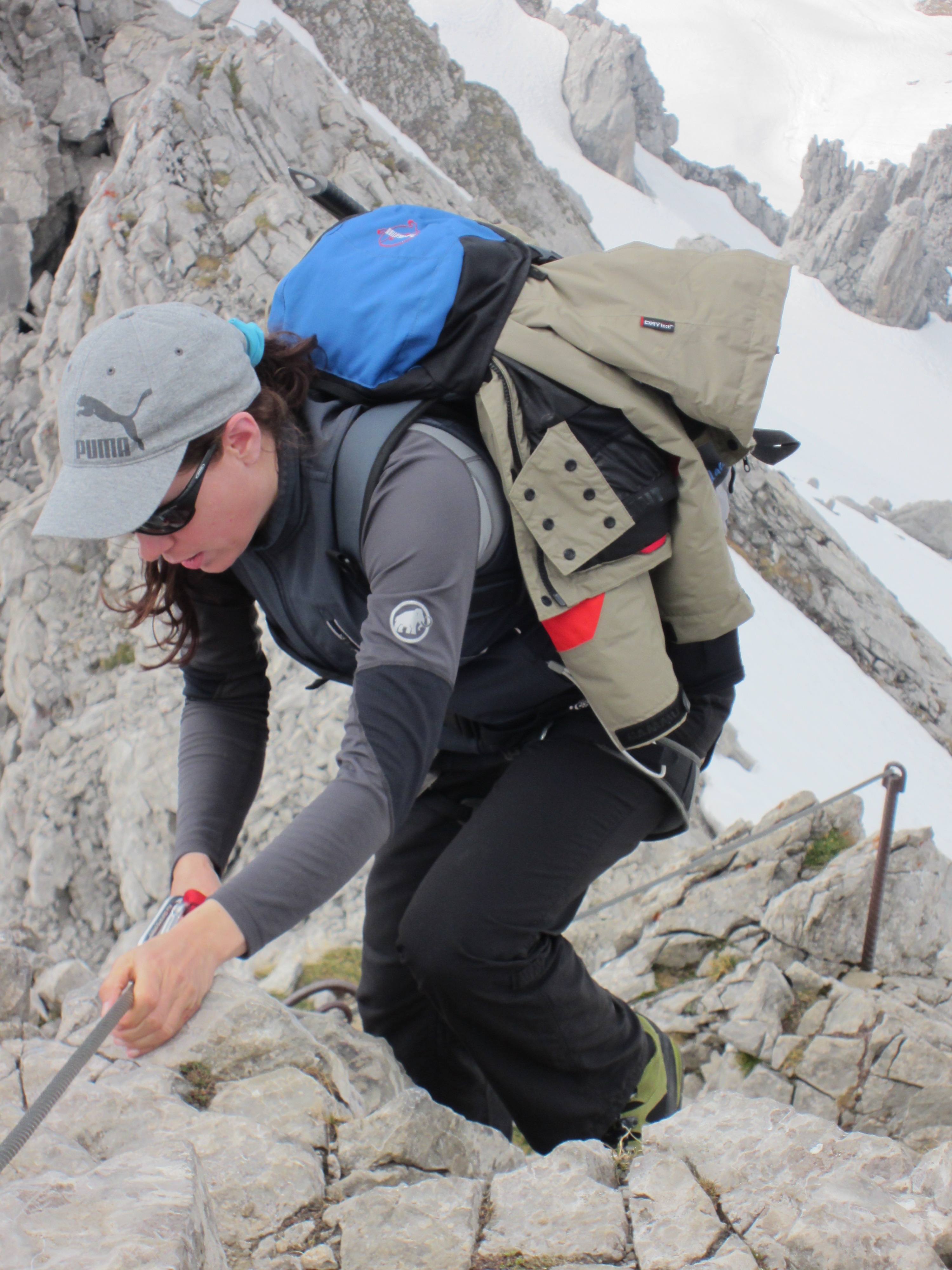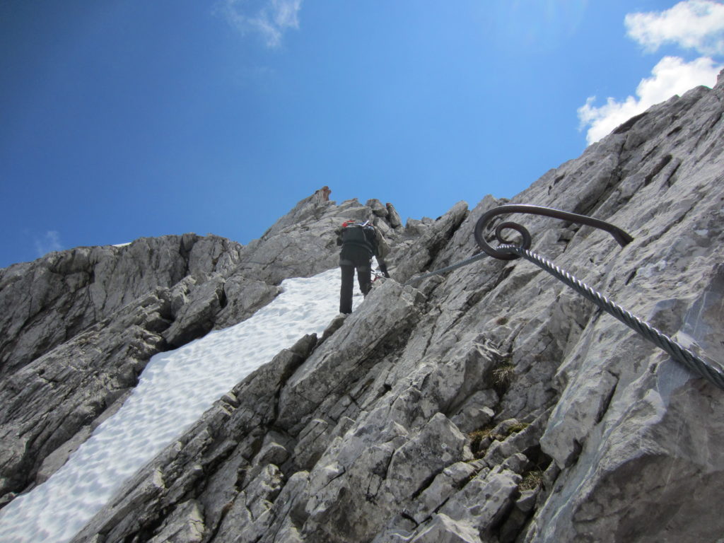 Teilweise war das Fixseil eine Hilfe, Teilweise wäre es aber nicht wirklich nötig gewesen. Da habe ich Touren gemacht, wo manch einer froh gewesen wäre um ein solches Fixseil. Aber wie gesagt, gab es hier Stellen, wo auch wir uns mit der Bandschlinge sicherten. Wir hatten ja trockene Verhältnisse. Denke, bei anderen Verhältnissen ist das Fixseil eine Hilfe. Zumal es stellenweise doch recht luftig war. Nun, so viel zum Fixseil.