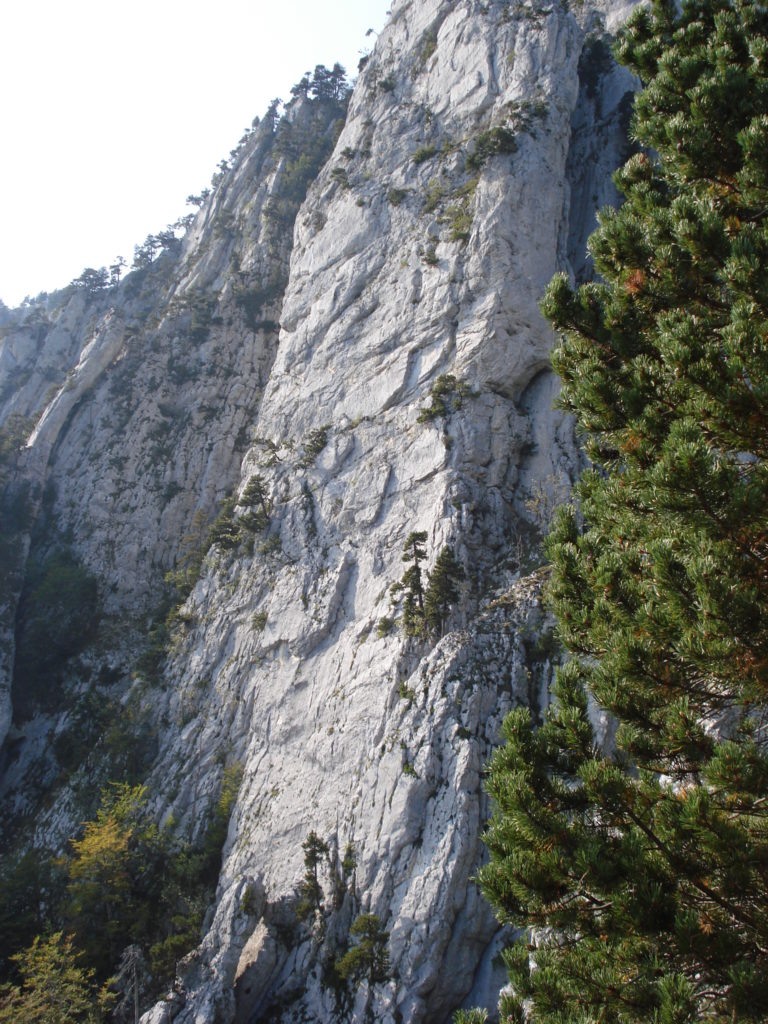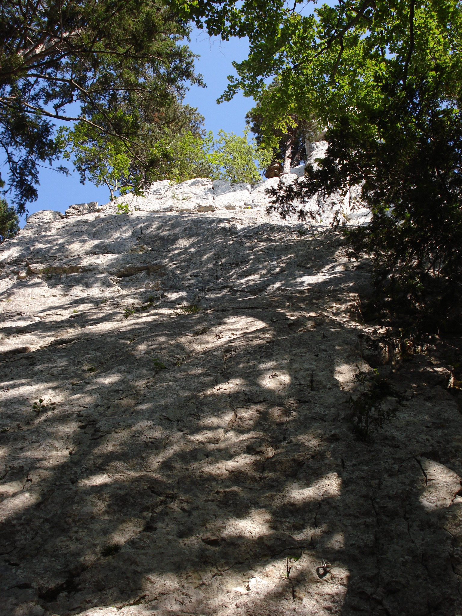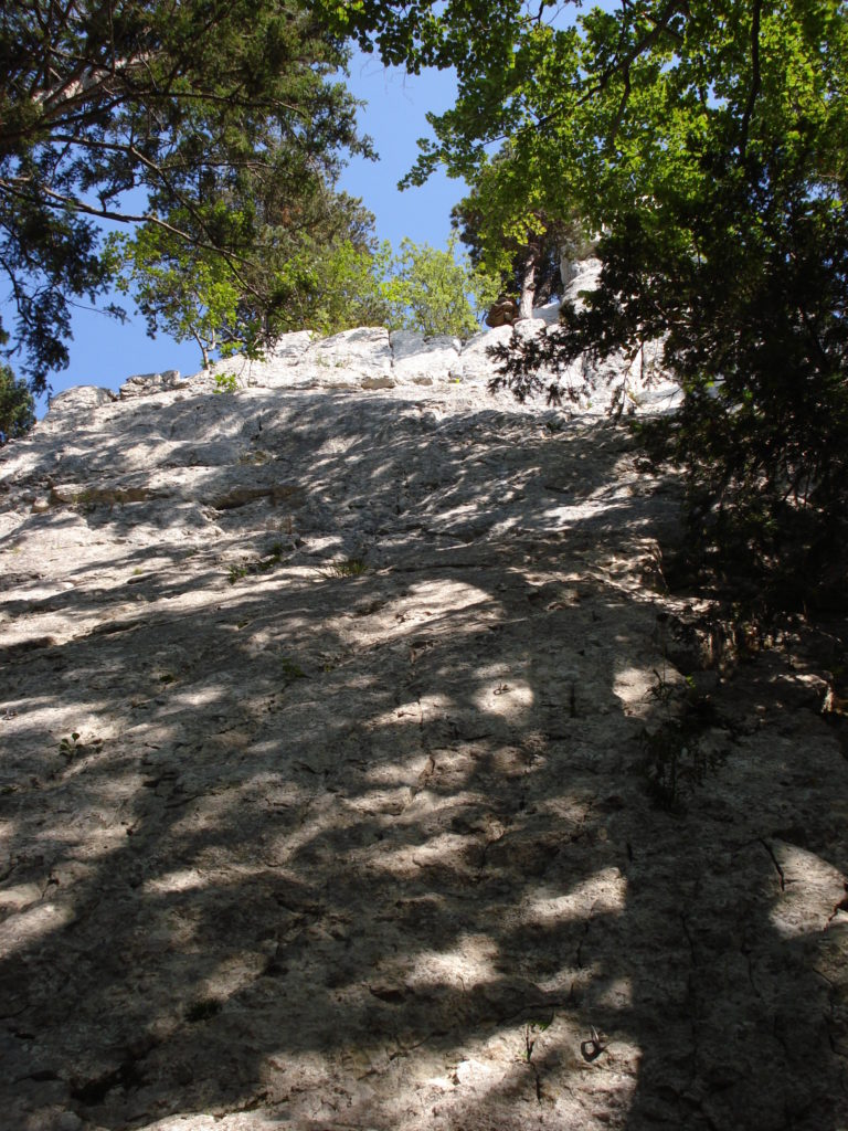 Beim Stand oben muss man über die Felsen steigen und auf der anderen Seite runter. Der Weg ist auch da nicht ganz einfach zu finden. Es hat sehr viele Bäume und ist etwas unübersichtlich. Man geht links weg und steigt dort den Felsen entlang weiter. Gesichert werden kann nur noch mit Schlingen. Am besten macht man kurz vor dem Coulouar noch einen Stand. Im Coulouar selbst gibts nur noch einen einzigen Hacken. Der letze Stand ist dann wiederum an einem Baum wenn man aus der Rinne/ Coulouar steigt. Hier endet die Südwand.