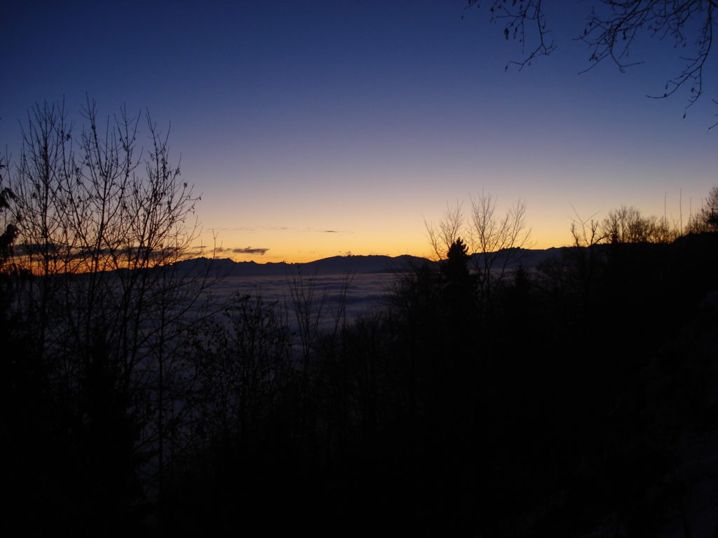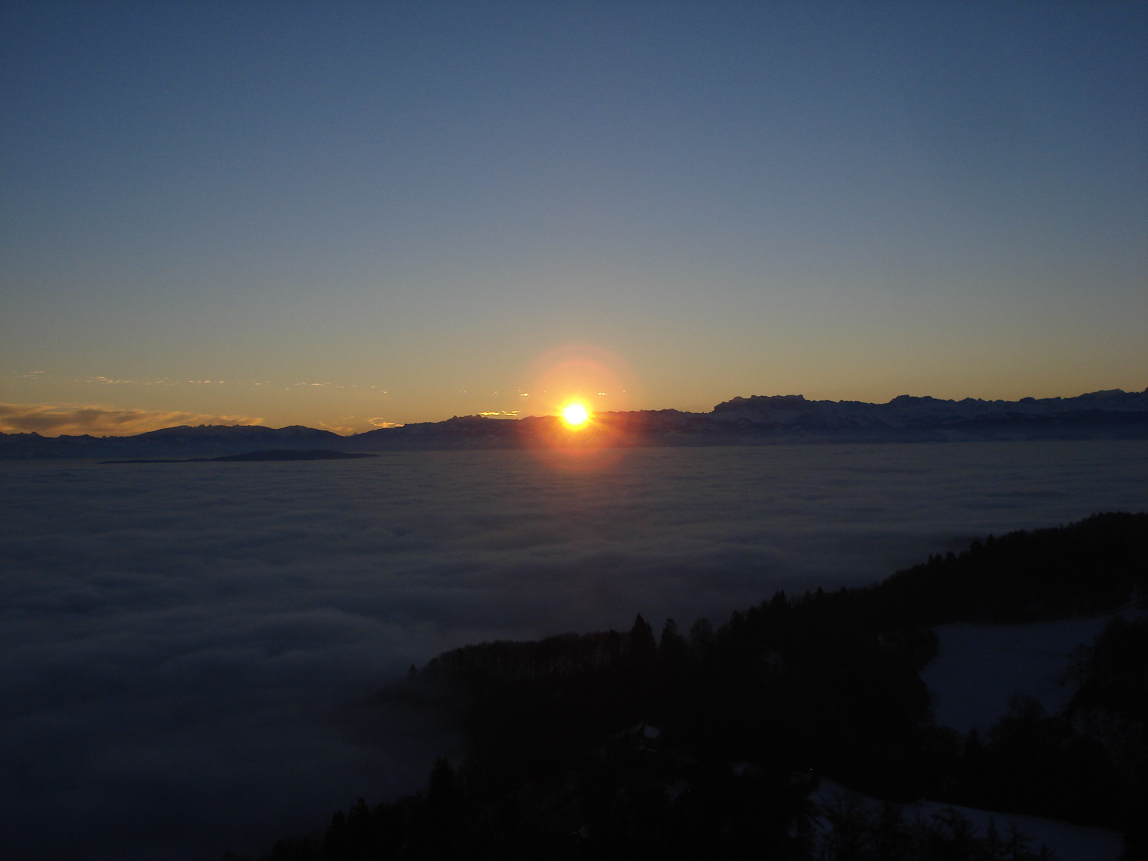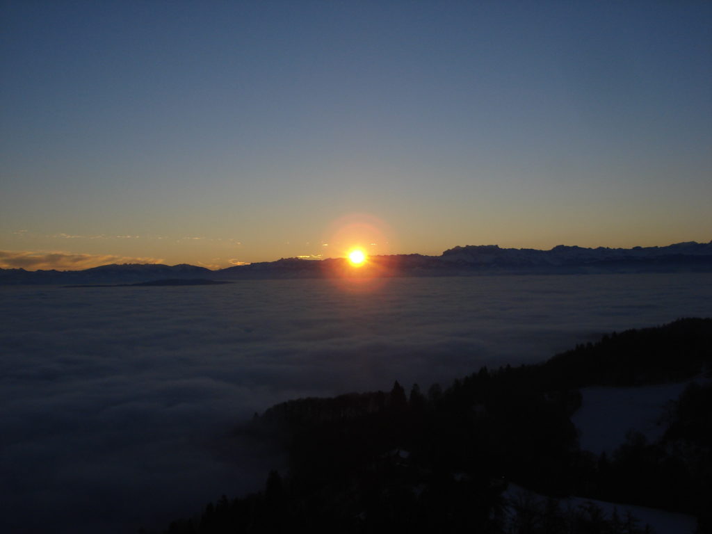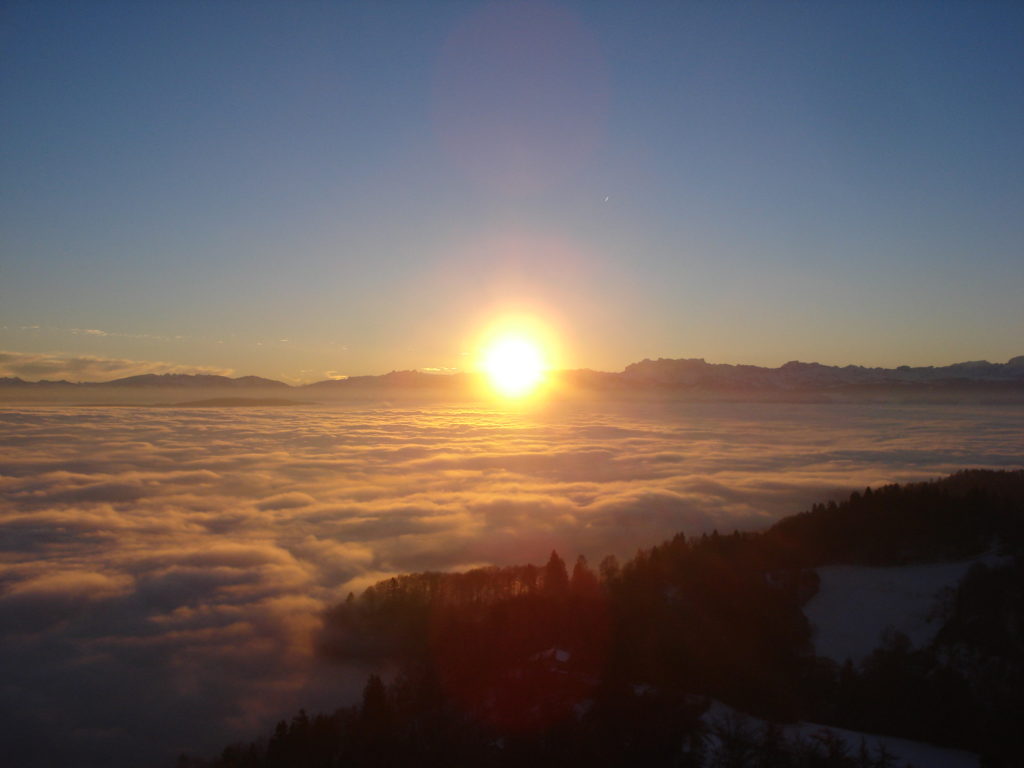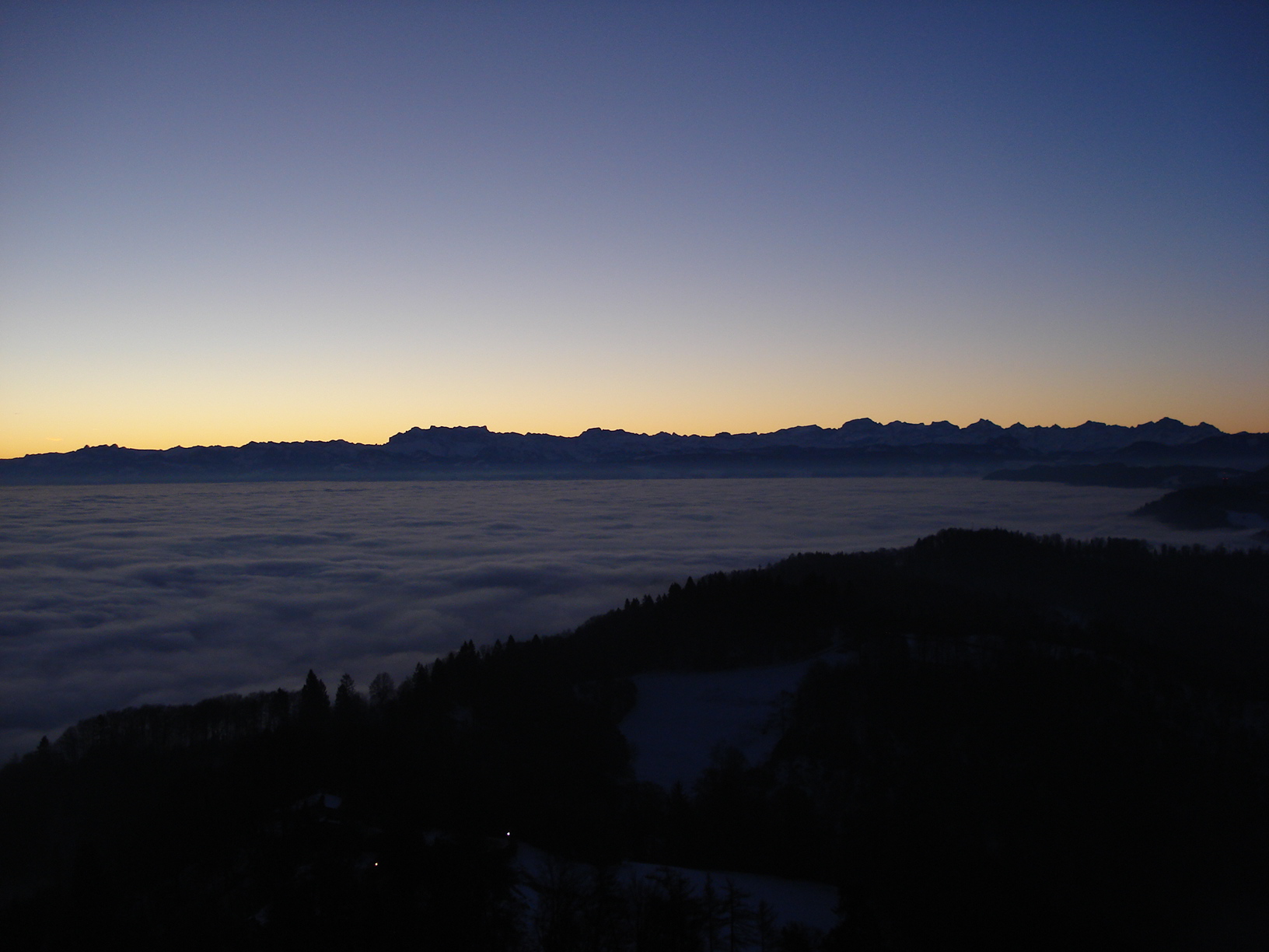 Der Blick auf die Berge und das Nebelmeer war wunderschön! Kurz vor Sonnenaufgang kamen nochmals drei Leute auf den Turm, und das an einem Donnerstag. Wie das wohl am Wochenende aussieht? Aber alle waren ruhig und warteten gespannt bis die Sonne über dem Horizont erschien. Ein grandioser Anblick, der alle erfreute. Das ganze wirkte sehr mystisch mit dem Nebelmeer und den Bergen in der Ferne.