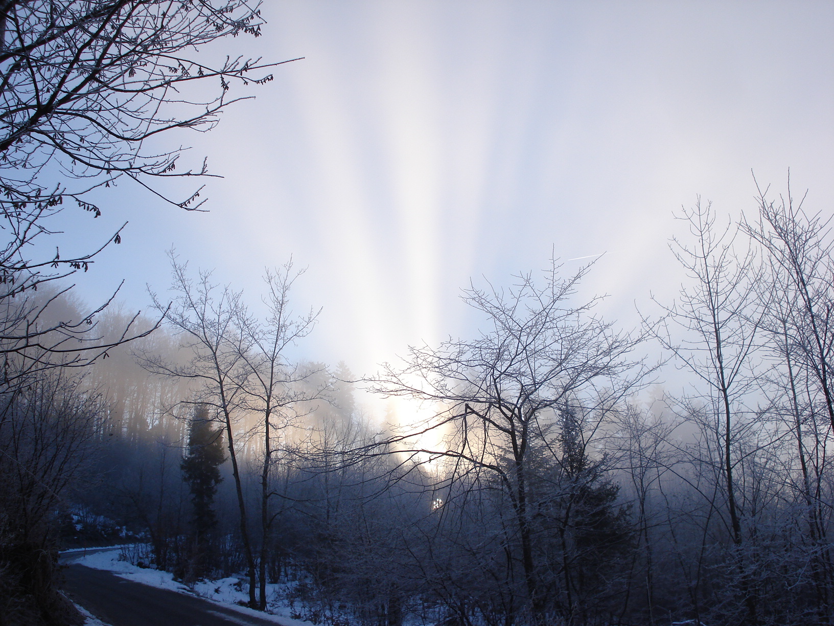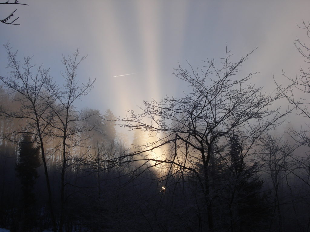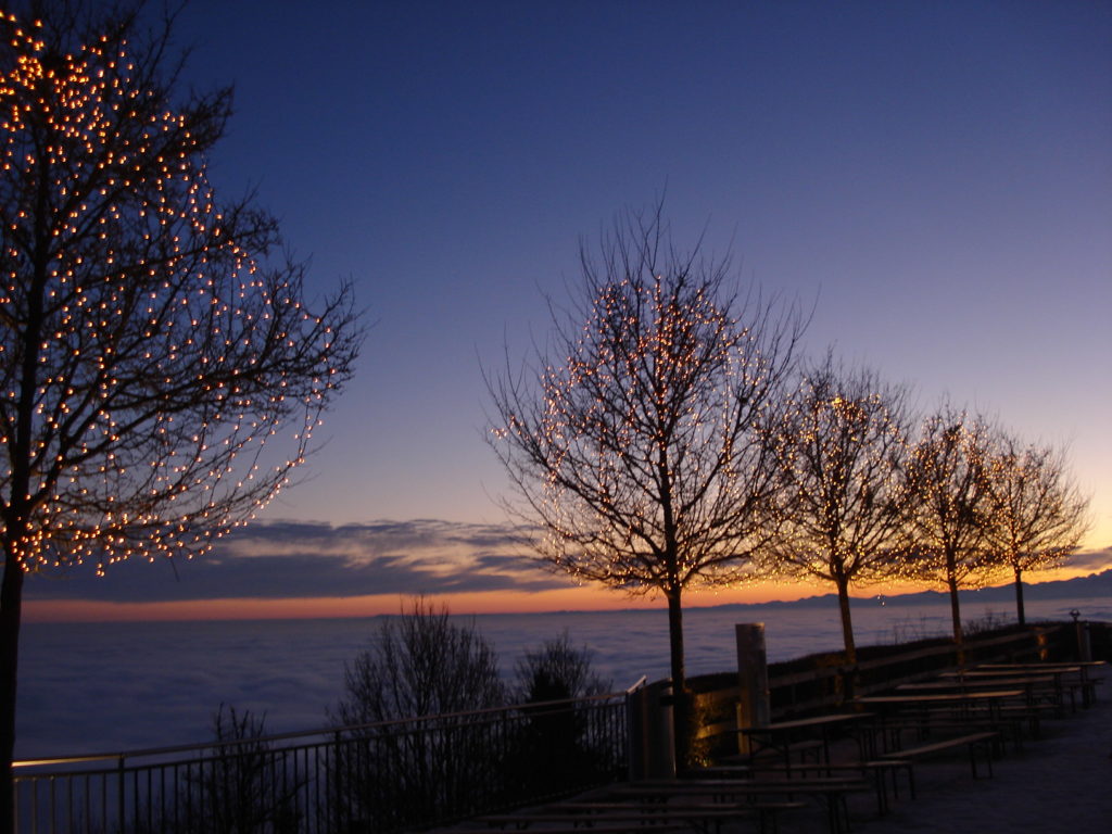 Nachdem ich Thiger unterwegs aufgeladen hatte parkten wir direkt in Ringlikon an der Langwiesenstrasse. Wir versäumten es, bereits dort in den Wanderweg einzusteigen und liefen erstmal Richtung Bahnhof Ringlikon. Bereits hier ging es hinauf, dafür war die Strasse mehrheitlich trocken. Kurz vor dem Bahnhof Ringlikon geht dann der Wanderweg rechts weg, welchen wir nahmen. So liefen wir etwas parallel zu den Geleisen im Wald hoch. Immer wieder eindrücklich, wenn sich ein Zug durch den Wald schlängelte, so im dunkeln und regelmässig Pfiff. Dann querten wir einmal die Strasse, welche hier einen ziemlichen Bogen macht und auch die Bahn ihre Schlaufe hat. Wieder bogen wir auf den Wanderweg ein. Der Weg ist stark frequentiert, das merkte man auch daran, das es sehr oft glatt war und man schön aufpasste musste, nicht auf der Nase zu landen. Der Wanderweg mündet beim Bahnhof Üetliberg, wir querten nochmals die Strasse um wieder auf dem Wanderweg nach oben zu gelangen. Nun hatten wir bereits die Nebelgrenze durchbrochen und man merkte doch, dass sich langsam der Tag ankündete. Als wir gegen den Bahnhof hochkamen, sah man bereits den Turm mit den Lichtern durch die Bäume leuchten, das sah klasse aus. Also schnurstracks vom Wanderweg einmal um den Uto Kulm direkt zum Aussichtsturm. Wir stiegen hoch und waren nicht die ersten, ein Fotograph war hier schon fleissig am knipsen.